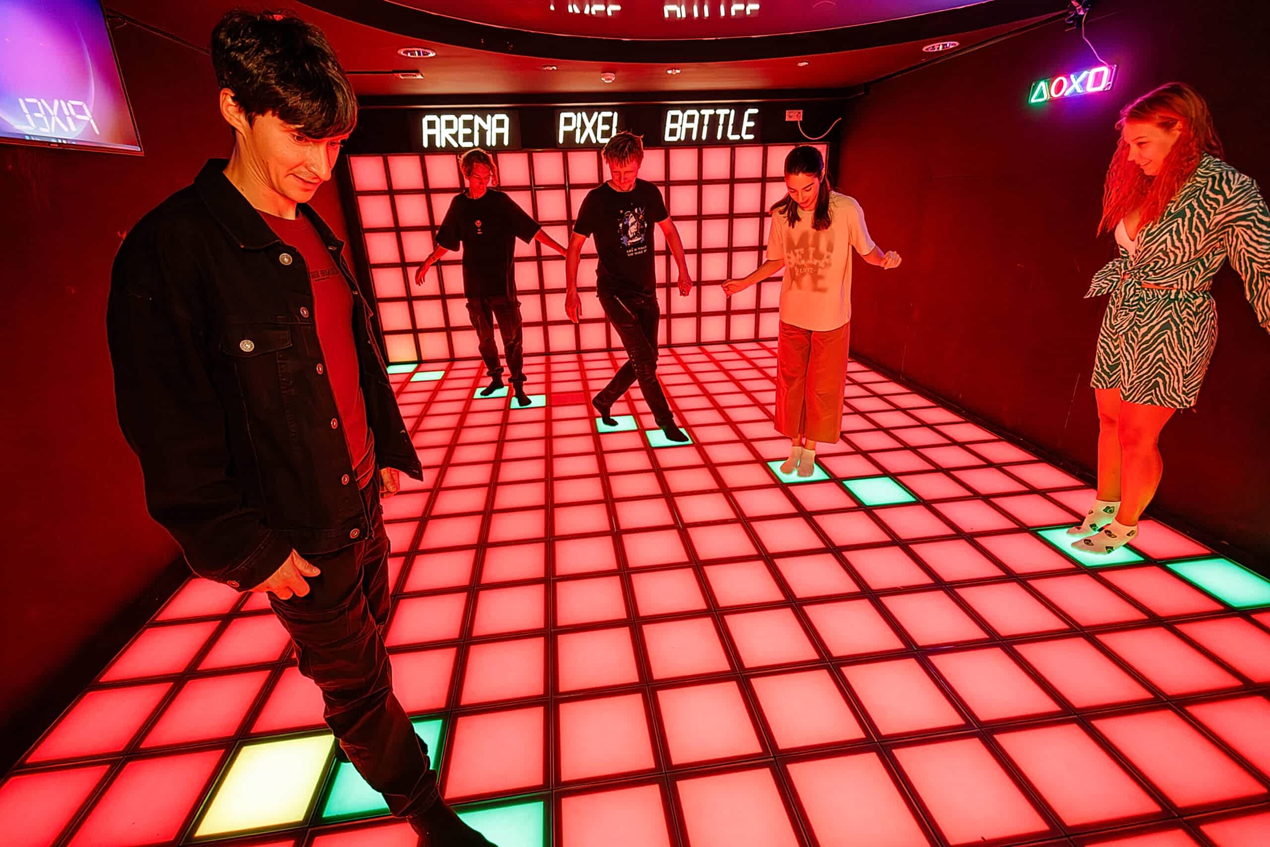 «Экшн игра Пиксель батл »- активная веселая игра на пиксельном полу, можно Pin Up как детям от 6 лет , так и взрослы